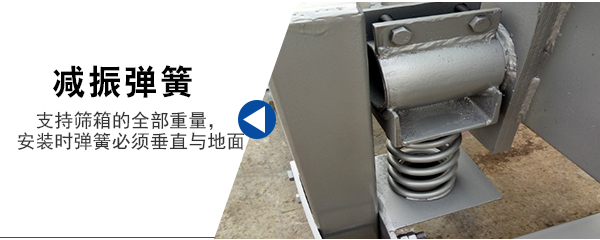 6、減振彈簧:阻止振動(dòng)傳給地面,同時(shí)支持篩箱的全部重量,安裝時(shí),彈簧必須垂直與地面。
