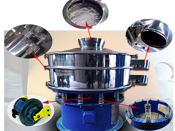 旋振篩主要由進(jìn)料口、防塵蓋、出料口、束環(huán)、篩網(wǎng)、配重塊、上部重錘、振動(dòng)體、振動(dòng)電機(jī)、彈簧、下部重錘、機(jī)座等部分組成。