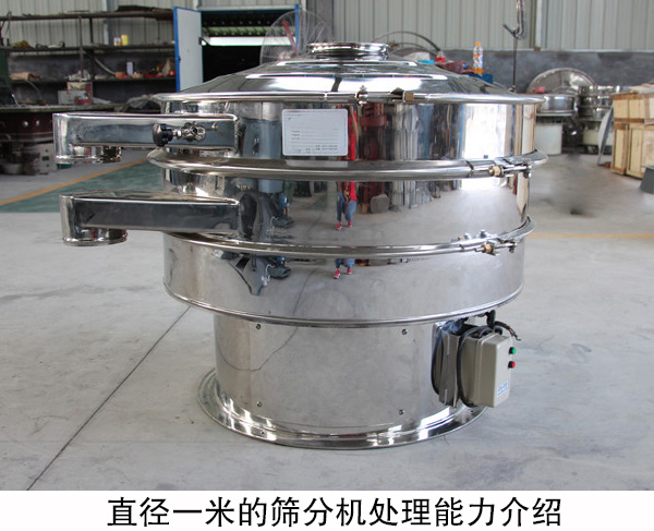 直徑一米的篩分機功率為0.75kw,篩分直徑為920m/m,入粒粒度小于10mm,電壓為380V,轉速達到1440r/min,以物料為大砂的干式篩分條件下,可處理800kg/h,篩分產(chǎn)量相對較大,屬于旋振篩里的中型設備。