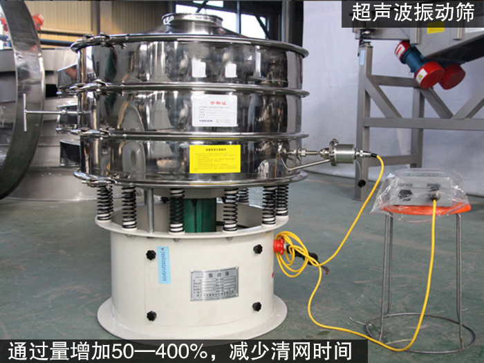 超聲波振動篩電源產(chǎn)生的高頻電通過換能器轉(zhuǎn)換成高頻正弦形式的縱向振蕩波,這些振蕩波傳到共振器上產(chǎn)生共振,然后由共振器將振動均勻傳輸至篩面。篩面在做低頻三次元振動篩的同時,疊加上超聲波振動,能夠有效的解決因團聚、靜電、強吸附性卡堵網(wǎng)孔等篩分難題,不僅可提高篩分產(chǎn)量,還可提高了精度。