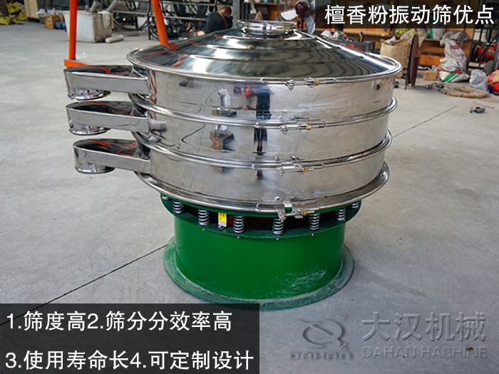 檀香粉是能夠清心安神,消除疲勞的作用,在使用前,要把它加工成適合使用的顆粒,這樣才可以讓其物盡其用那么作為一種粉末狀物料,在加工時如何進行篩分成一定的規(guī)格呢?應(yīng)該選用什么振動篩呢?