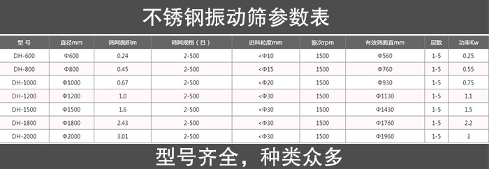 不銹鋼直線振動(dòng)篩是在碳鋼直線振動(dòng)篩的基礎(chǔ)上采用了不銹鋼材質(zhì),但是也是有所差異的,大漢的不銹鋼直線振動(dòng)篩不只有半不銹鋼材質(zhì)的,還有全不銹鋼材質(zhì)的,型號(hào)種類非常齊全,具體參數(shù)詳見上圖參數(shù)表。