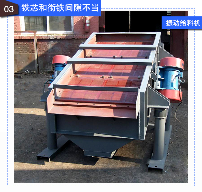 給料機(jī)鐵芯和銜鐵之間的間隙過大或者過小造成的,若出現(xiàn)這種情況,都會因機(jī)器達(dá)不到正常的振幅而影響給料機(jī)的給料。