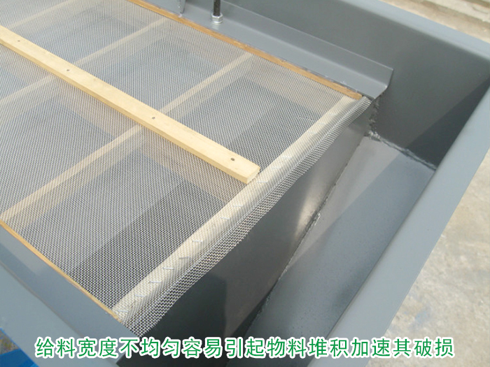 在直線振動(dòng)篩的篩分過程中,振動(dòng)篩面的寬度決定其處理能力,長度決定其篩分效果,如果在對(duì)振動(dòng)篩的給料過程中,給料量過大使設(shè)備無法對(duì)其進(jìn)行篩分,或給料寬度不均勻,引起物料堆積,都容易也使得篩網(wǎng)受力不均,加速其破損的情況。