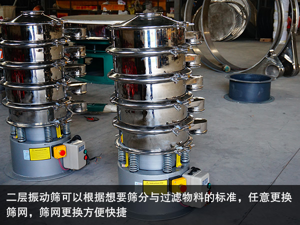 不銹鋼旋振篩是在碳鋼旋振篩基礎(chǔ)上,設(shè)計出的具有國內(nèi)先進水平的振動篩分設(shè)備,用于篩分對材質(zhì)有特殊要求的物料。二層振動篩與不銹鋼旋振篩是同一種產(chǎn)品不過有兩種叫法,此篩機是采用新型YZUL系列單法蘭振動電機,具有穩(wěn)定的激振力。這款振動篩可以篩分各種物料具有篩分特殊性、高粘度、細粒物料、細粉、微粉、及干、濕物料等多種物料,是篩分行業(yè)的好幫手。二層振動篩可以根據(jù)想要篩分與過濾物料的標(biāo)準(zhǔn),任意更換篩網(wǎng),篩網(wǎng)更換方便快捷。