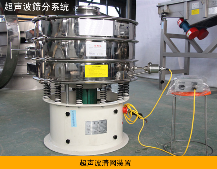該裝置是利用超聲振動(dòng)波對(duì)篩網(wǎng)進(jìn)行清網(wǎng)工作。其主要組成部件有超聲波電源、換能器與超聲波網(wǎng)架組成。其原理是通過超聲波電源將常規(guī)用電轉(zhuǎn)換為18KHZ高頻電能,通過換能器作用在網(wǎng)架上,從而解決高精細(xì)物料的清網(wǎng)與高效篩分工作。該裝置多用于振動(dòng)篩分機(jī)中,根據(jù)需要也可改裝后用于直線篩或搖擺篩中。