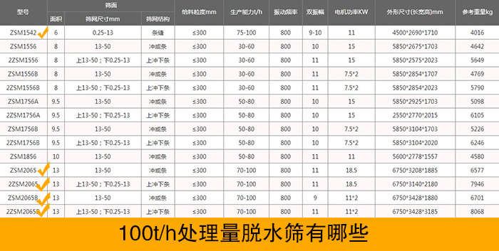 脫水篩中,型號(hào)眾多,以大漢脫水篩為例,其中處理量能達(dá)到100t/h的有以下幾種:ZSM1542,ZSM2065,2ZSM2065,ZSM2065B,2ZSM2065B等。具體參數(shù)如下:
